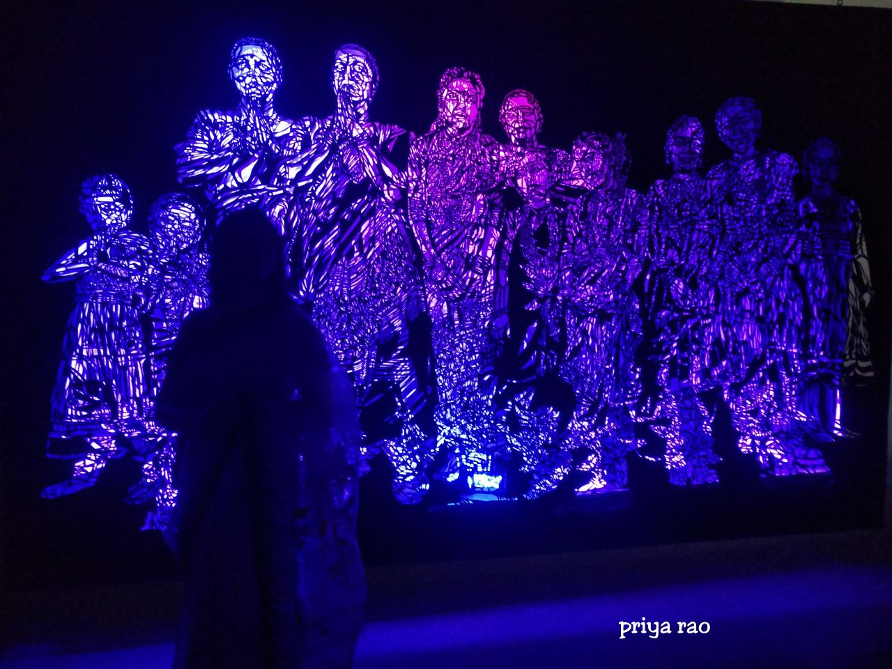 Overflow: Shilo Shiv Suleman uses embroidery as an artform on panels made of organza and fiberglass that extend from the ceiling to the floor. Her love poems on them captivate ur heart while the sheer beauty of this art enthrals and overflows!